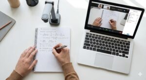 授業では、講師の顔だけでなく**手元のノート(書画)**を画面に映し出しながら解説を行います。 口頭での説明に加え、実際に「式変形の過程」や「図の書き方」をリアルタイムで記述して見せることで、視覚的にも理解しやすい授業を提供します。 板書を見る感覚で、ストレスなく受講していただけます。